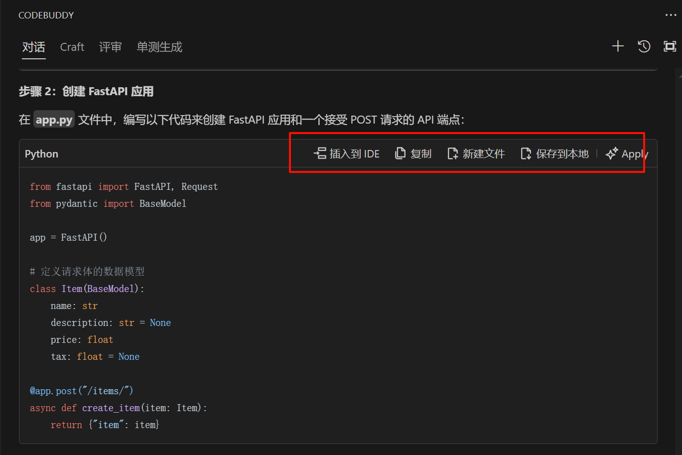 在生成的示例代码框中,内置了快捷操作,方便一键插入到代码区域,如下: