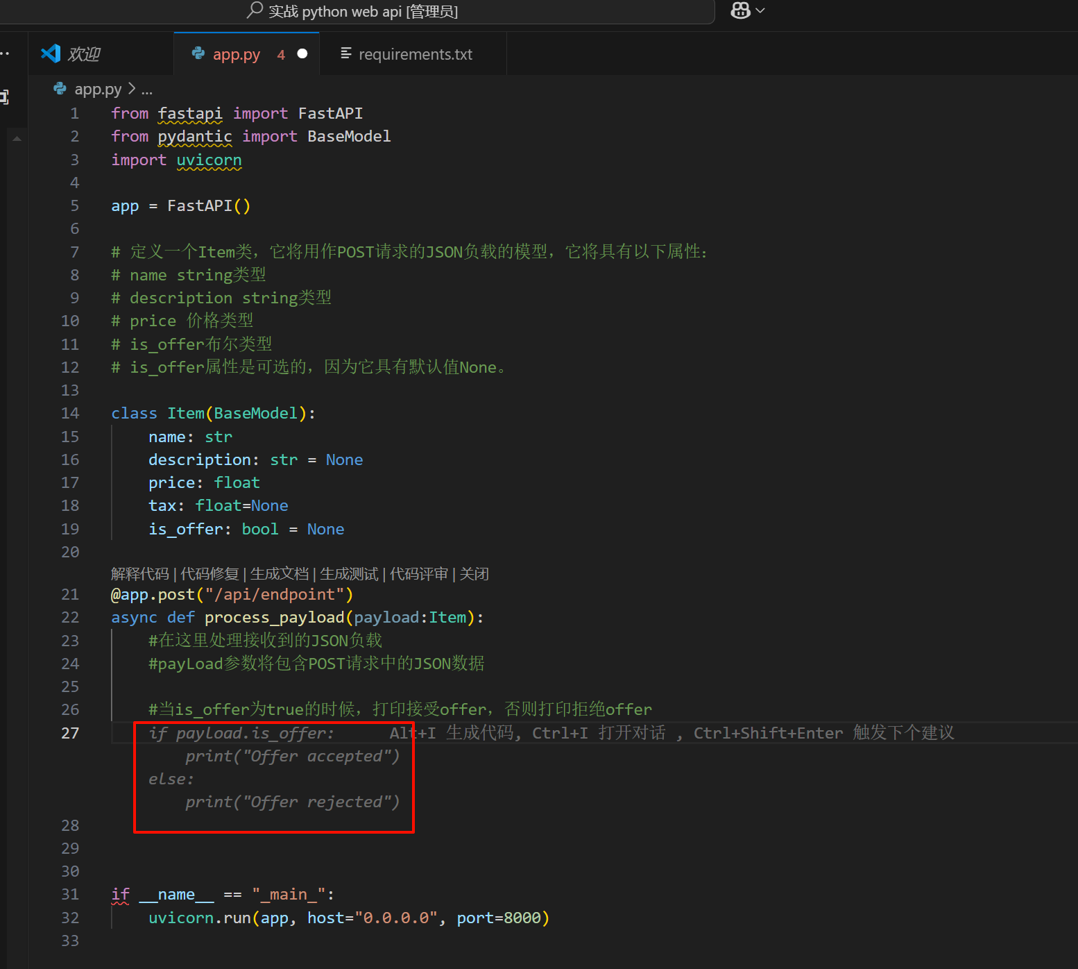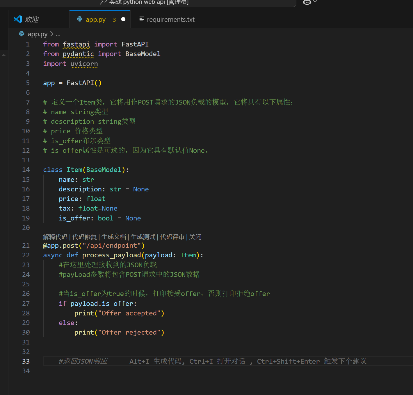 满足 Specifc 具体的特征,如下图,通过详细的注释,且定义无二义性。例如在11行并没有描述清楚布尔类型是可选还是必选,代码助手会帮助您进一步增加提示,而不是立刻帮助您完成代码补全。