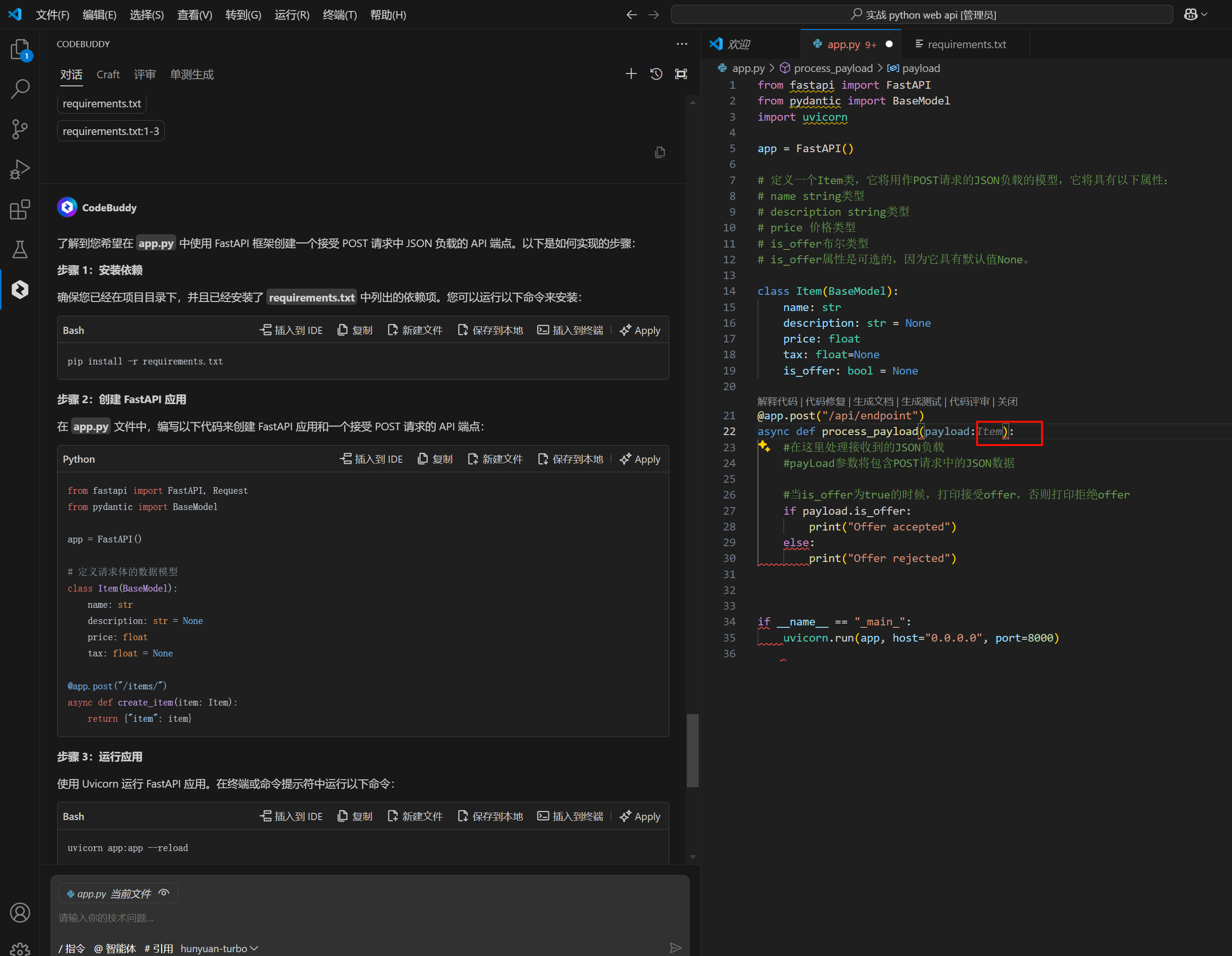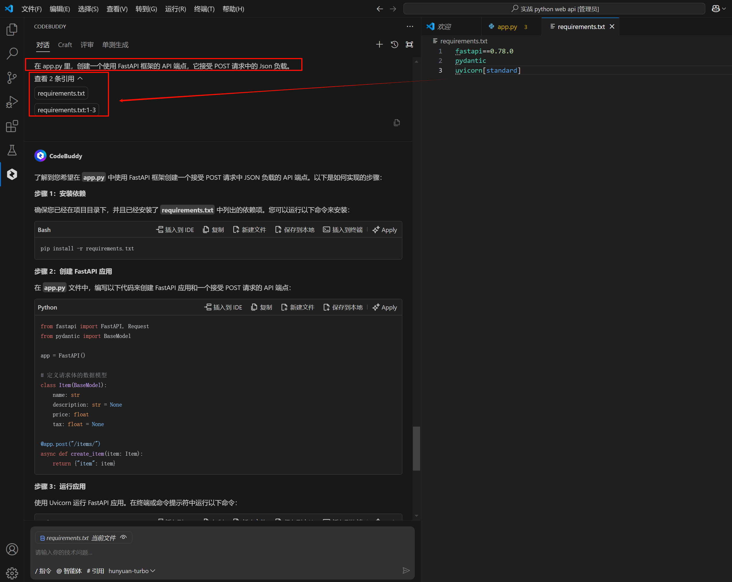 如下图,尝试打开一个 requirements.txt。这个文件用于定义 Python 文件所需库。通过它,让对话更清楚理解您想要做的需求。同时根据上文的对话继续回复,大多可以生成您想要的代码。