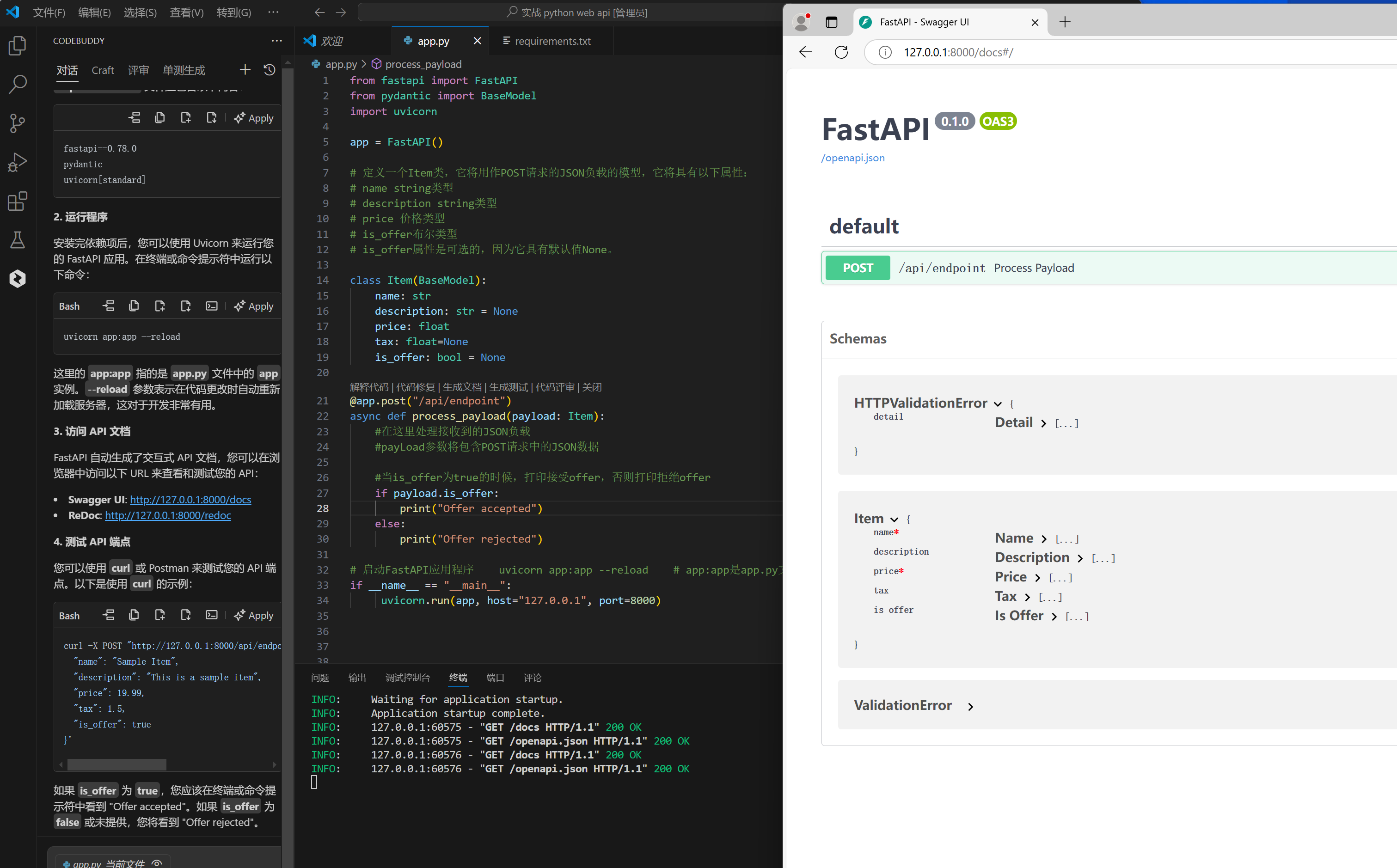 在终端中,依次执行命令,成功运行后,在浏览器中输入 localhost:8000/docs 来确认该端点显示是否正常工作,运行成功。