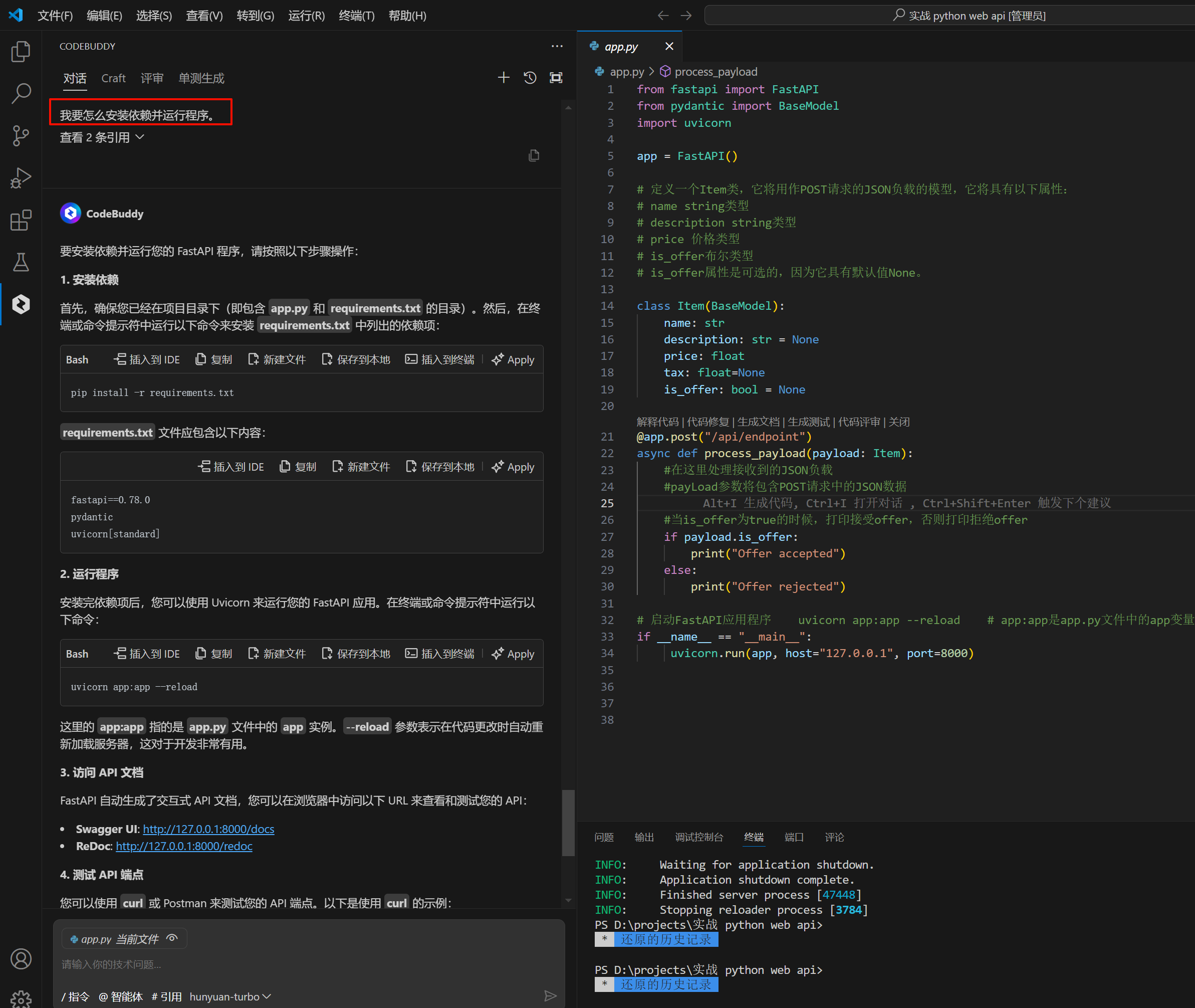 代码完成编写后不知道怎么运行,可以在对话框中,向代码助手提问“我要怎么安装依赖并运行程序”。如下图: