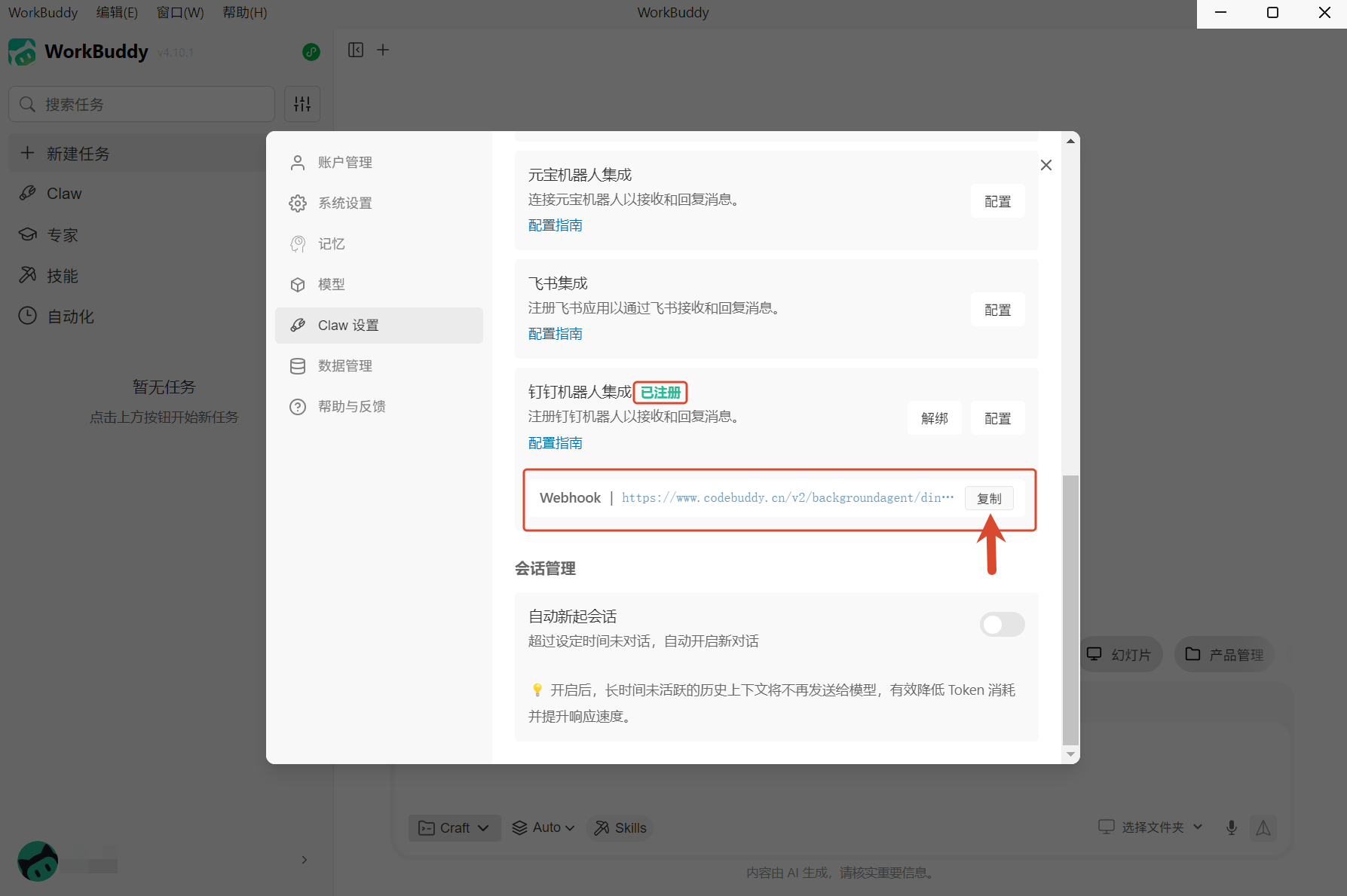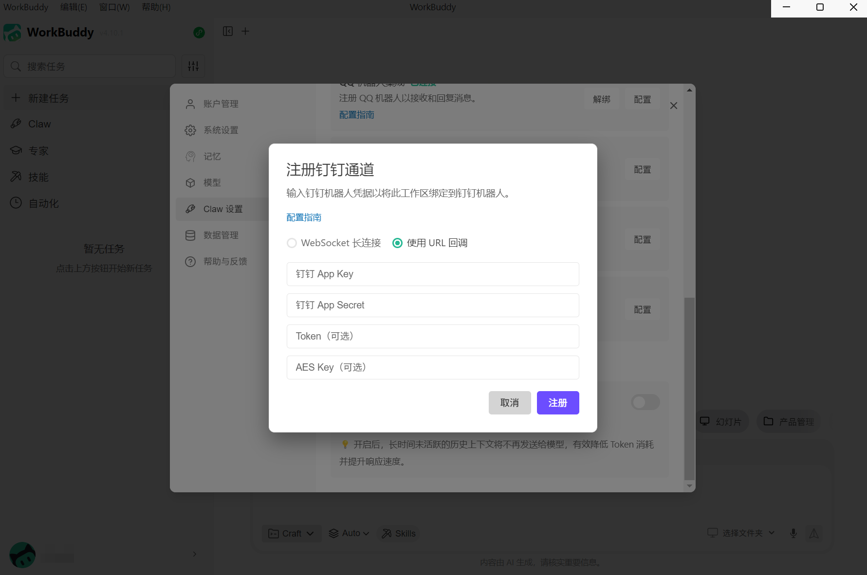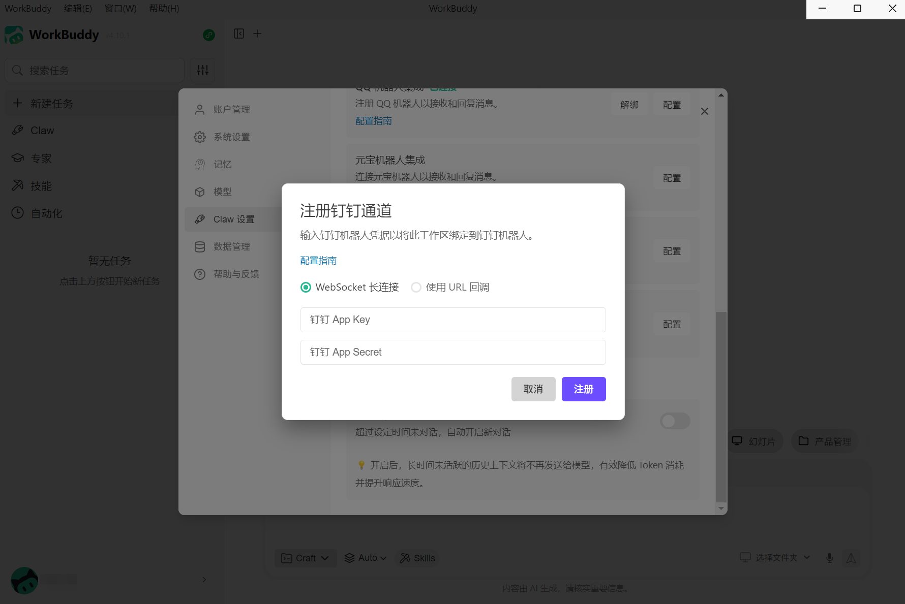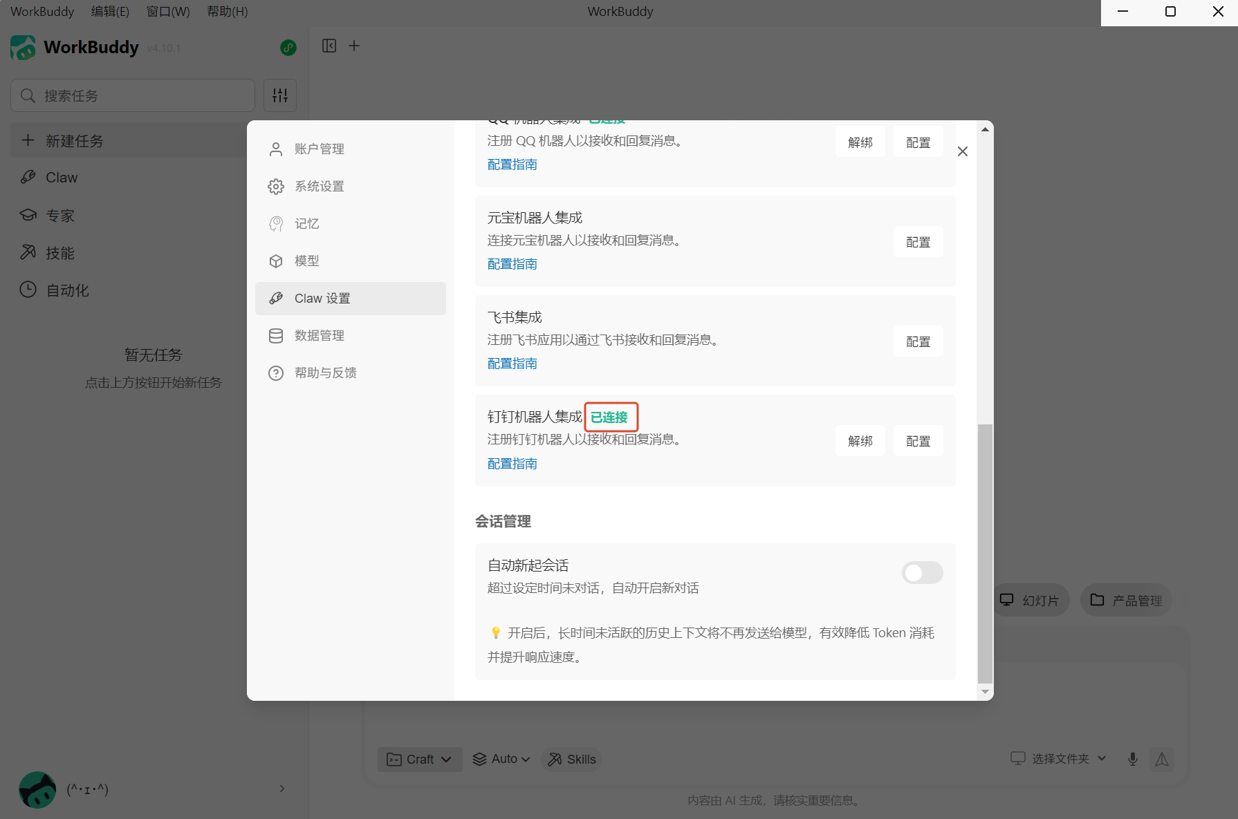 五、在 WorkBuddy 中配置钉钉