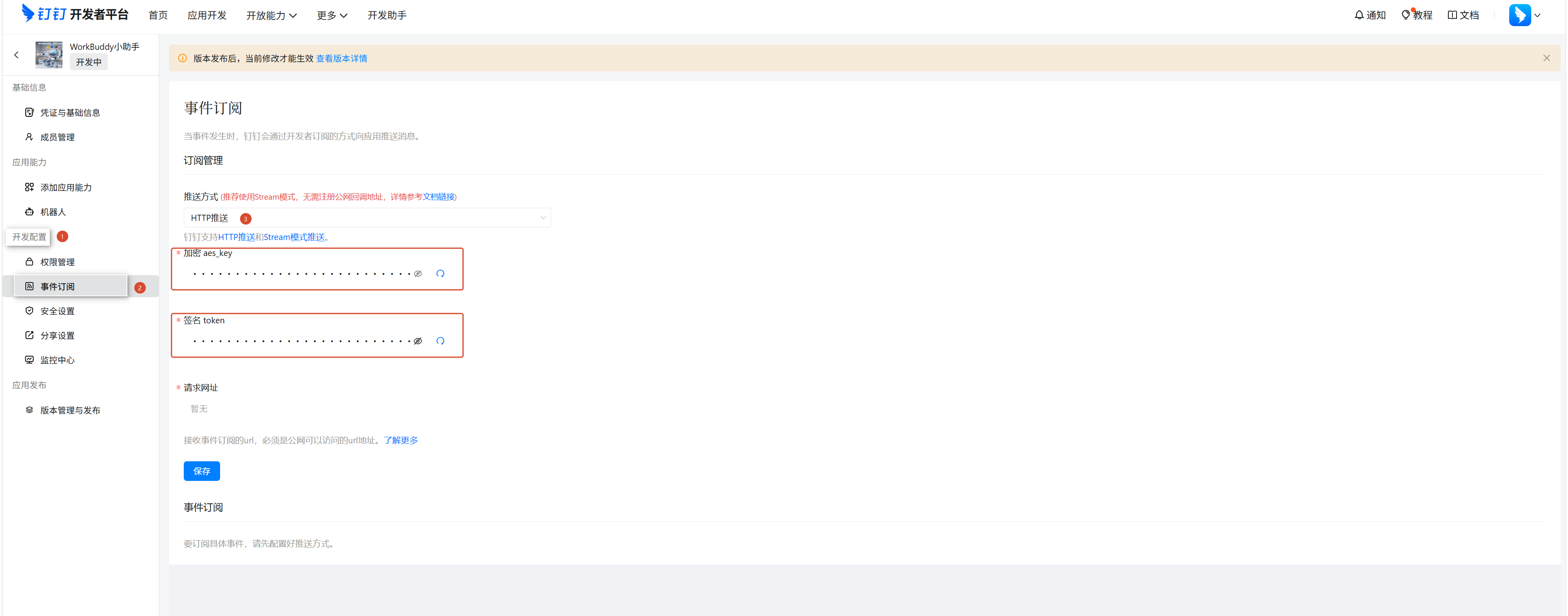在应用详情页左侧菜单中,点击「开发配置 - 事件订阅」,在「推送方式」中选择「HTTP推送」。