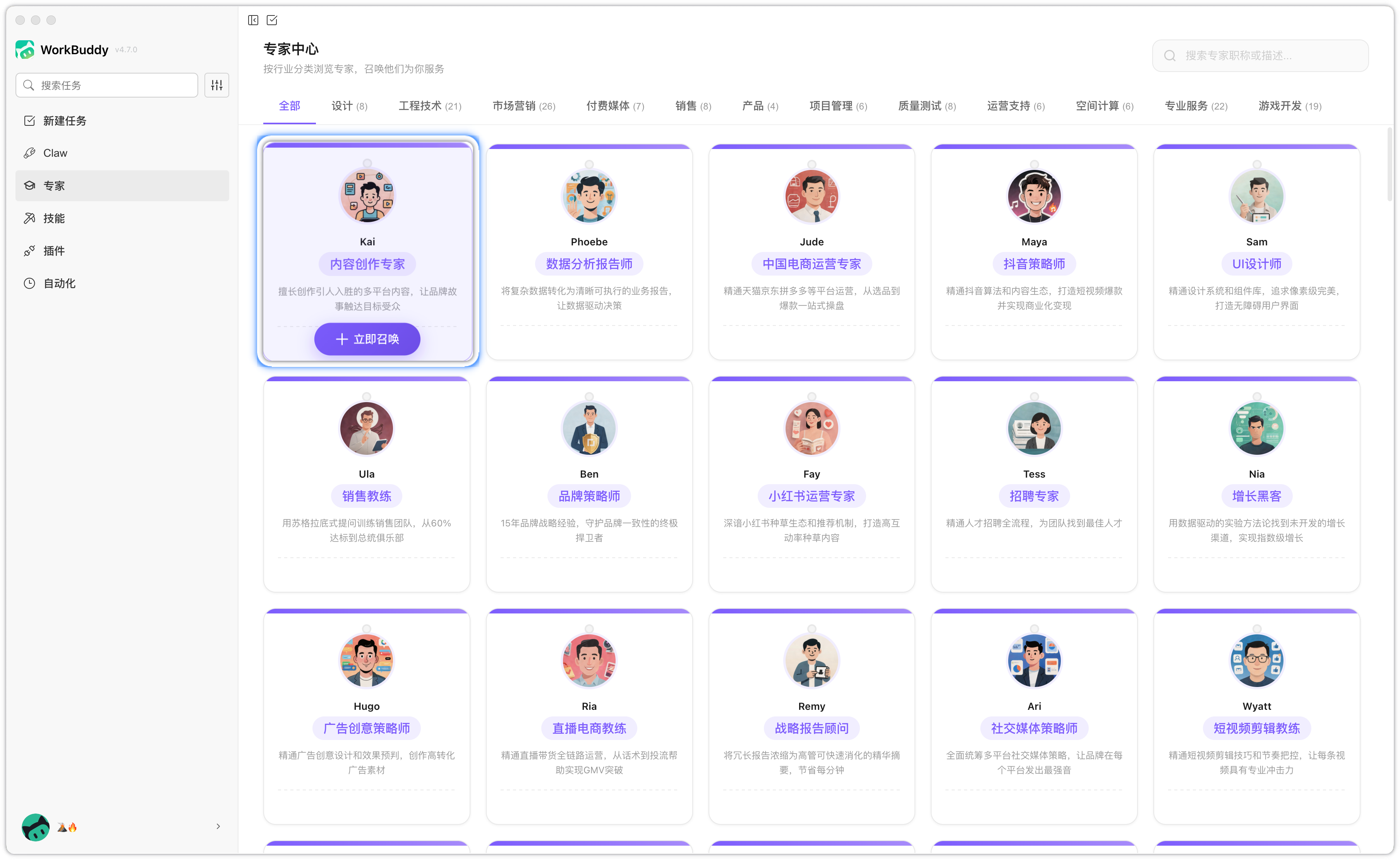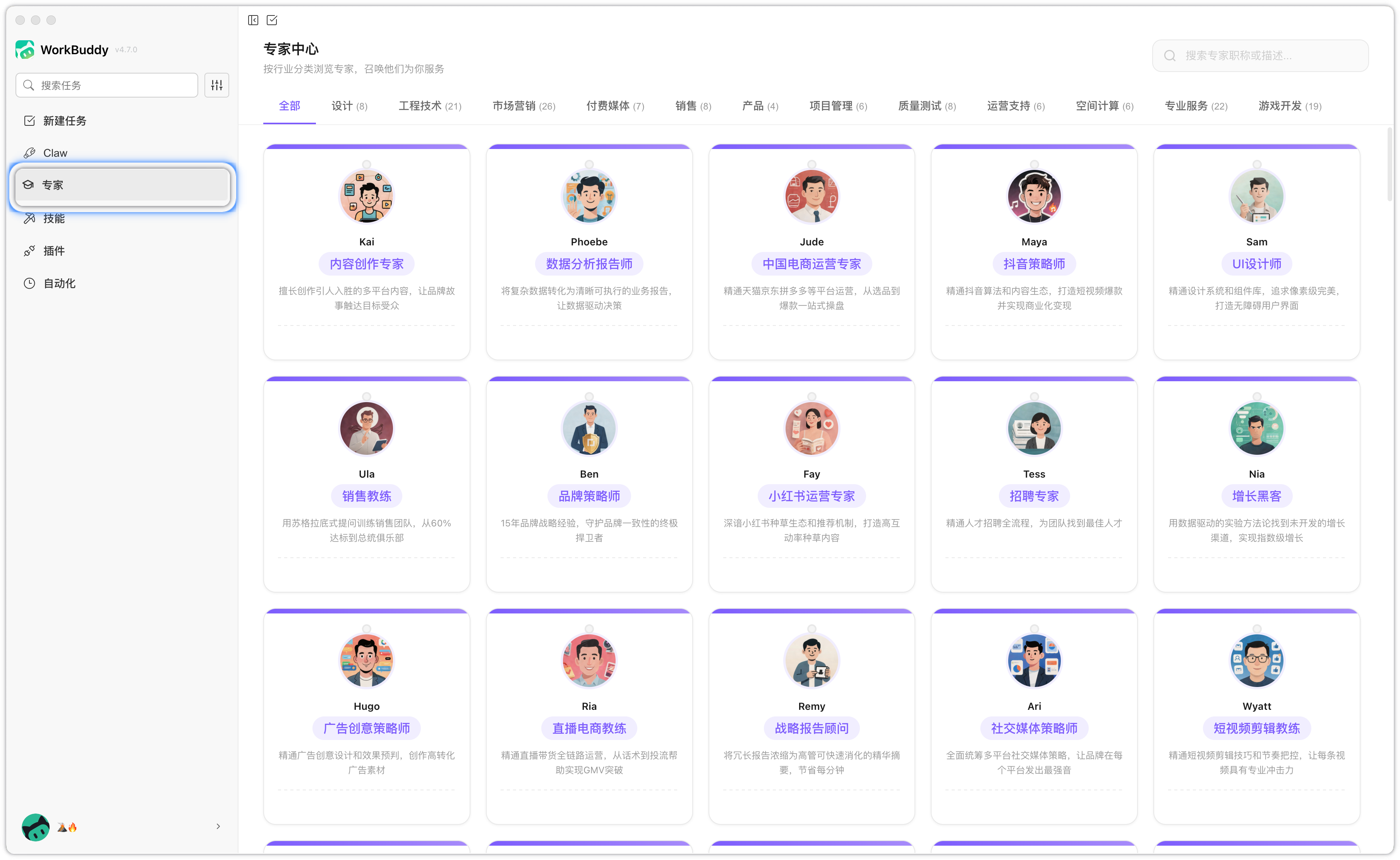 专家中心用于为 WorkBuddy 切换专业角色,使其在特定领域中以更明确的方法和视角完成任务。