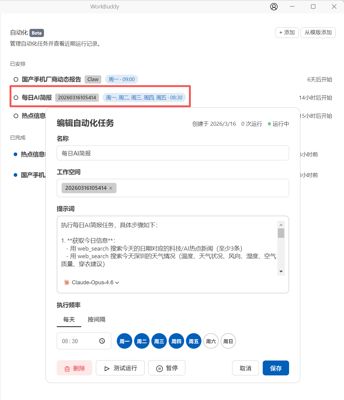 手动跑通后,可继续创建自动化任务,让简报按固定时间自动发送。