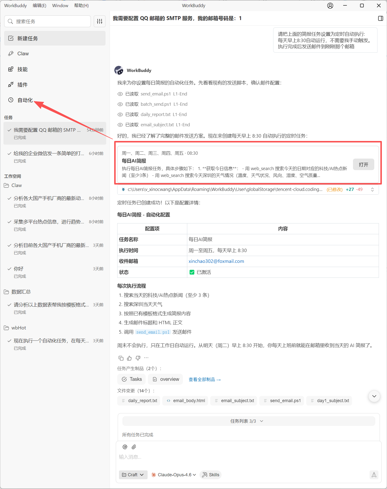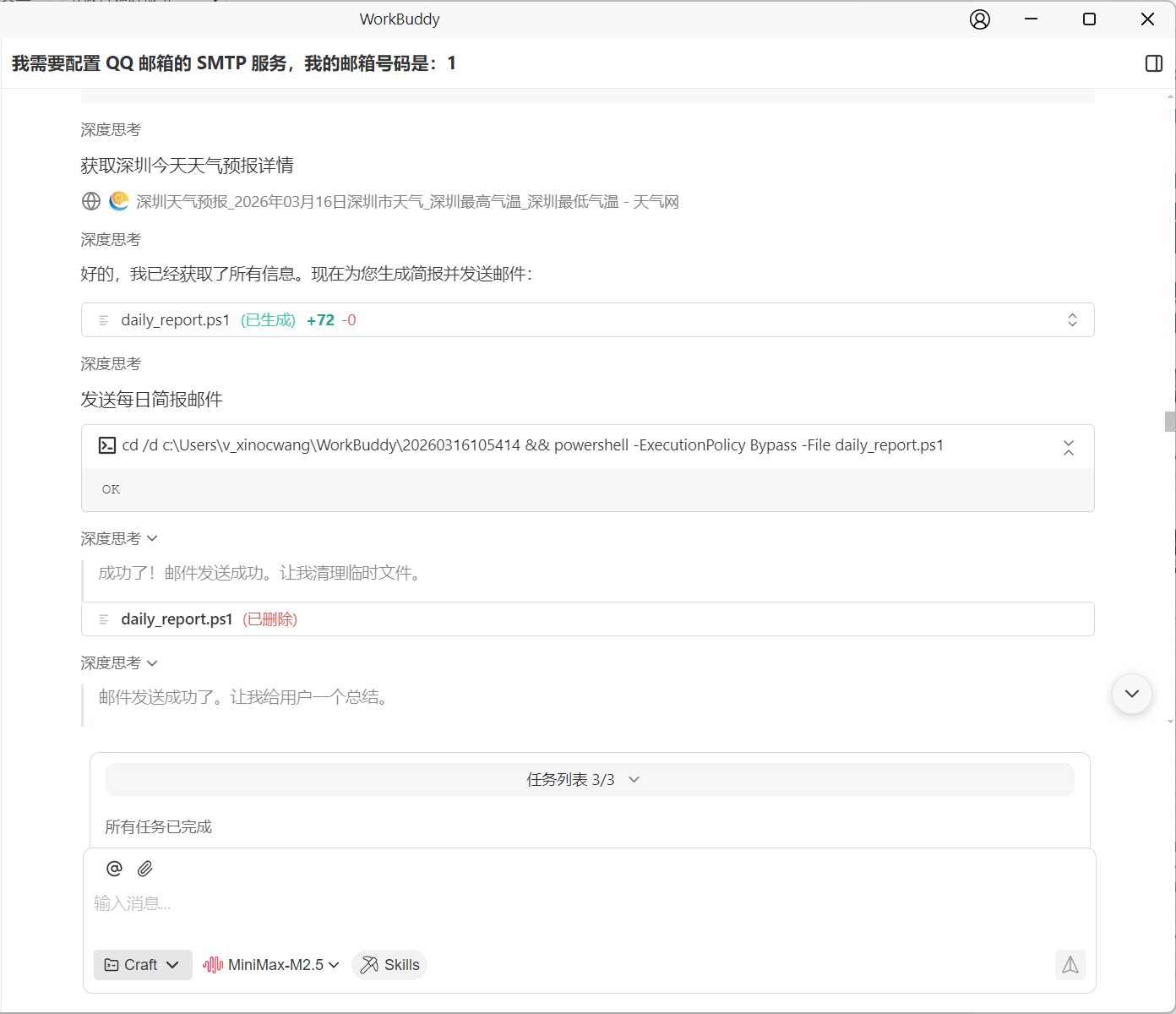执行过程中,WorkBuddy 通常会完成搜索、整理、生成和发送等步骤,整体耗时约 2 到 3 分钟。