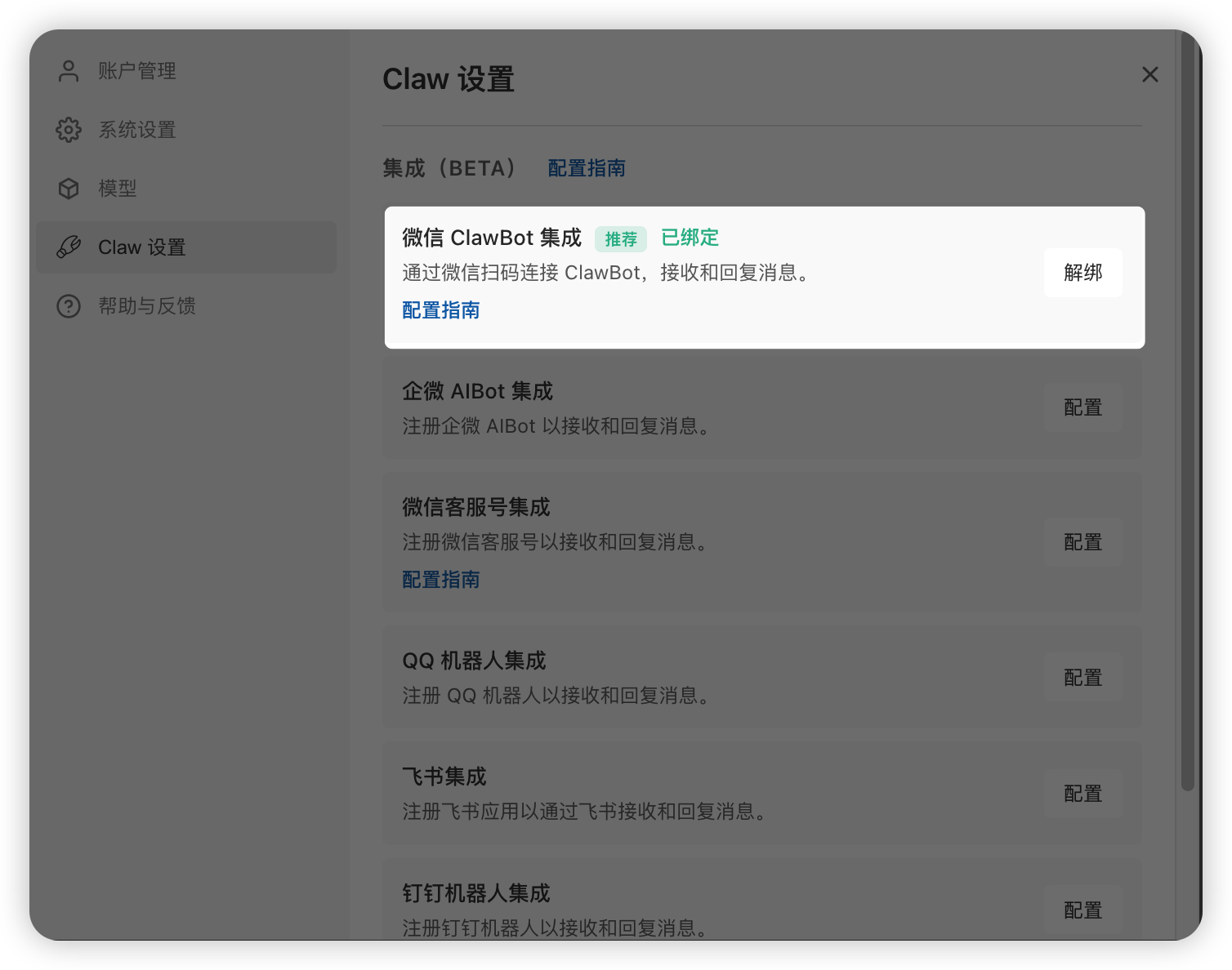 - 返回「Claw 设置」检查微信 ClawBot 集成状态是否仍为「已绑定」