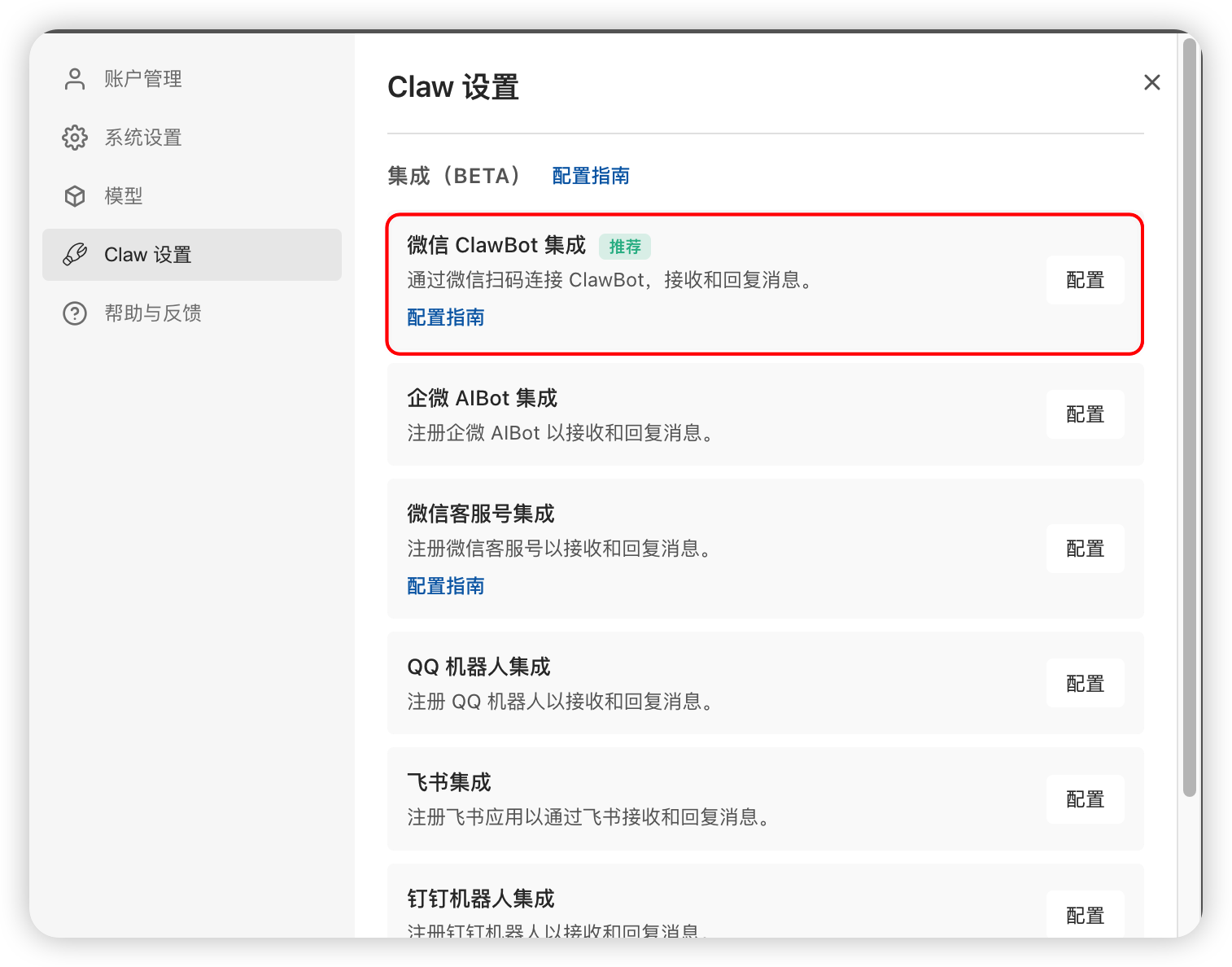 - 在集成列表中找到「微信 ClawBot 集成」