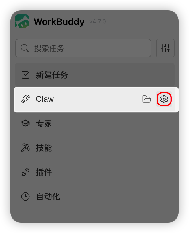 - 在左侧 Claw 栏点击齿轮图标,进入「Claw 设置」