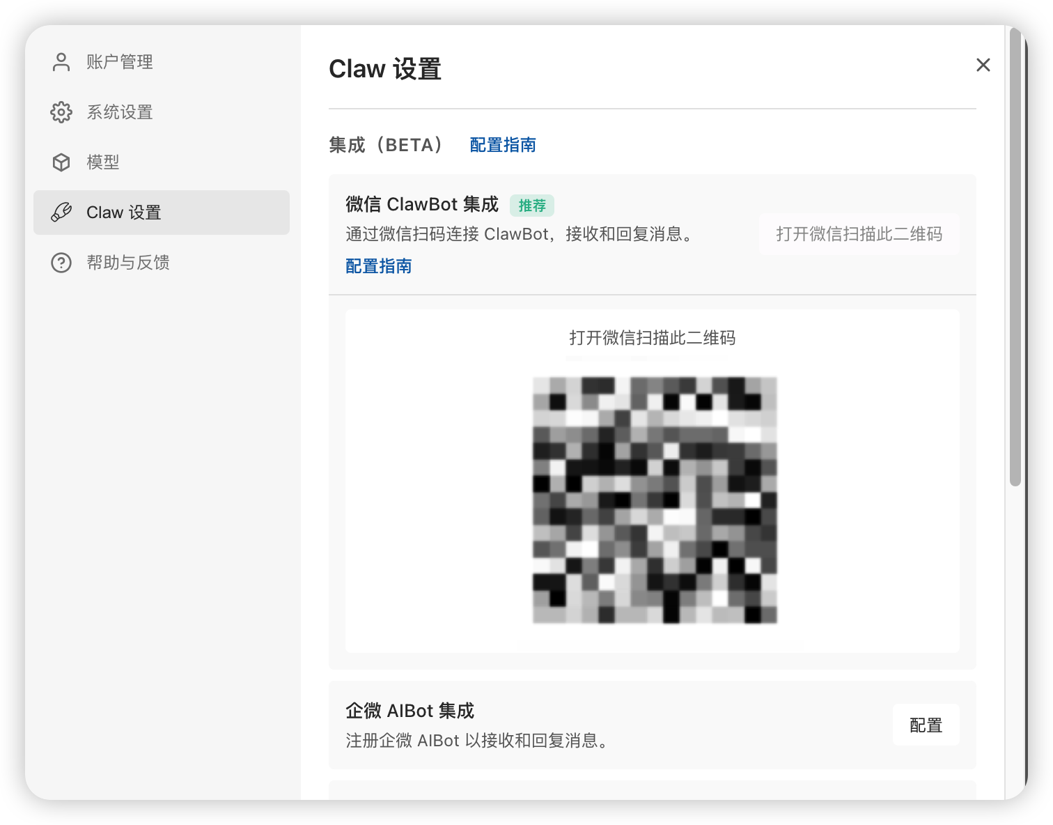 - 关闭当前配置窗口后重新进入「微信 ClawBot 集成」